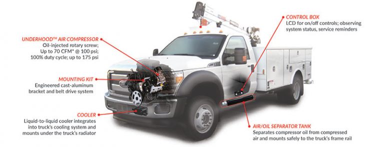 The UNDERHOOD™ 150 air compressor system is the best choice for customers who have concerns with space and weight on their service or utility truck.
